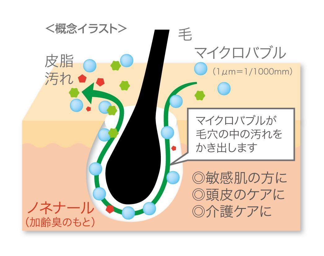 0.003mmという小さな空気の泡を浴槽内で発生させ、空気の泡の力でお風呂に浸かっているだけで毛穴の中まで綺麗に臭いも取れる新しい商品です。